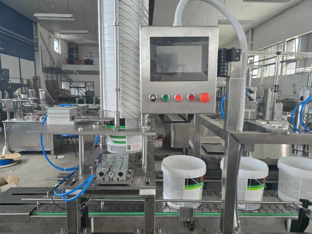 In the next phase of the cycle, the snap-on lid is taken and put on, which is also automatic for several types of packaging, then it is brought to the receiving table.