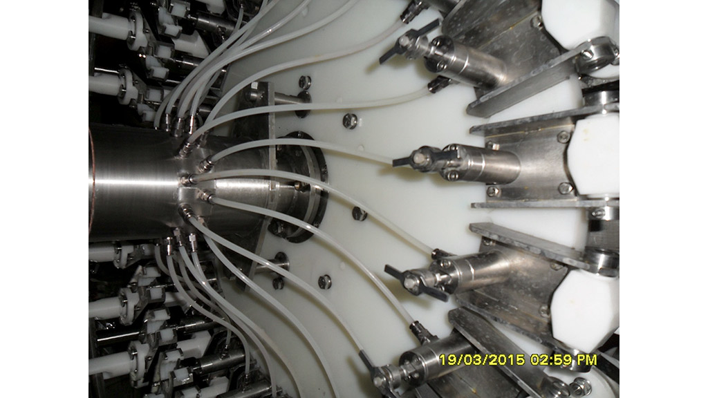 At the entrance there is a dividing screw gear which has the role of taking the bottles from the air transport or manually adding them to the conveyor and introducing them into the entrance star. From there, the bottles are taken with pliers, placed on syringes and rinsed in a circular flow. In the end, the bottles are returned to their original position (upside down) and handed over to the exit star, which transports them further to the filler.
