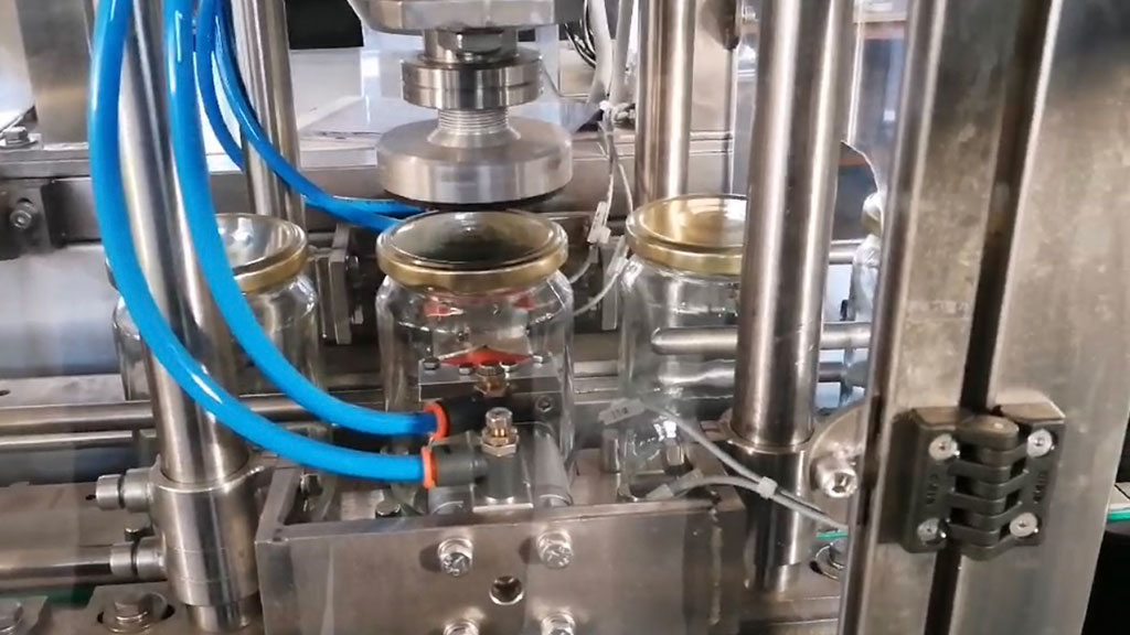 The drive unit consists of a motor reducer and a stepper reducer that provides tact (stepping) movement of the belt. This mechanism ensures smooth movement of the conveyor, as well as precise positioning of the jars on the workstations. The dosing module is designed as a piston doser with pneumatic drive and precise mechanical control of the dosed amount. Liquid is supplied from the container located on the machine. The valve system separates the liquid suction and liquid push strokes. The unit for adding and pressing the closures consists of a magazine in which the closures are placed, a rotary feeder, a channel for guiding the lids, as well as a pneumatic mechanism for pressing the closures on the jar. The twist off shutter unit consists of a base, a motor with a transmission mechanism, a pneumatic cylinder for guiding the shutter head as well as the shutter head itself.