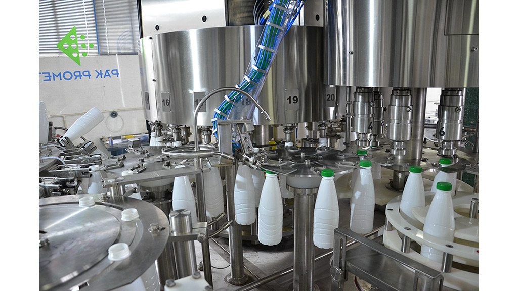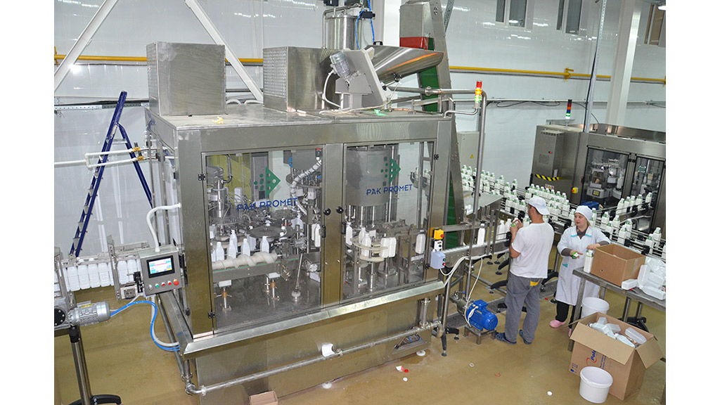 At the entrance there is a dividing screw gear which has the role of taking the bottles from the air transport and introducing them into the entrance star. From there, the bottles are taken with pliers, placed on syringes and rinsed in a circular flow. In the end, the bottles are returned to their original position (upside down) and handed over to the exit star, which transports them further to the filler. Yogurt with pieces of fruit can also be dosed with the flow metric system. The circular filler is equipped with a sensor for controlling the liquid level in the container, regulating the flow of liquid and an automatic machine washing system. The third part is a sealer which has its own selector plugs, a system for inserting the cap on the bottle and screwing to the set moment, necessary for the bottle to be properly closed. Presence sensor controlled release bottle caps only when the bottle is present. The filler base, all protective covers and other elements that come into contact with the liquid to be packaged are made of stainless steel. The electrical control part is placed in special cabinets with a seal protected from moisture.